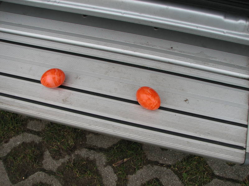 We worden gewekt door de Paashaas, want wanneer we de deur van de camper open doen zien we twee eieren op het opstapje van de camper liggen, dank je wel Paashaas.