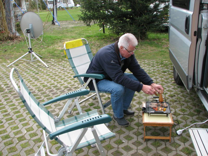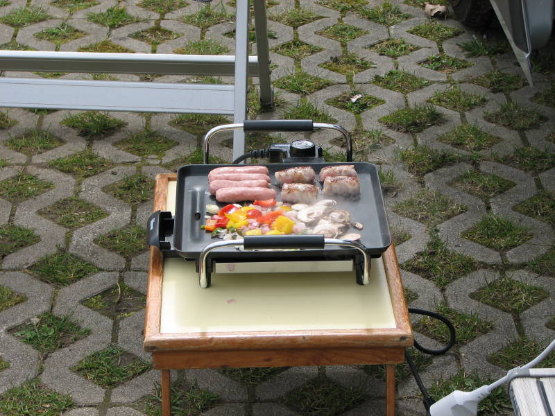 We hebben uitgeslapen, het weer is grijs en fris, we blijven vandaag bij de camper. In de loop van de ochtend wordt het weer wat beter en we gaan om één uur gourmetten op de nieuwe Tristar bakplaat. Het gaat boven verwachting goed, de bakplaat wordt goed heet en het vlees en de groente smaken prima, zie onderstaande foto's.