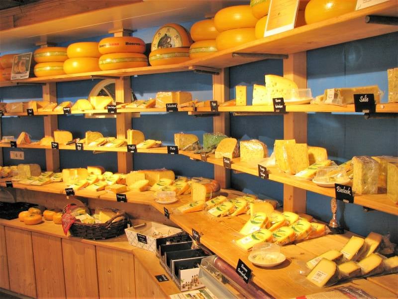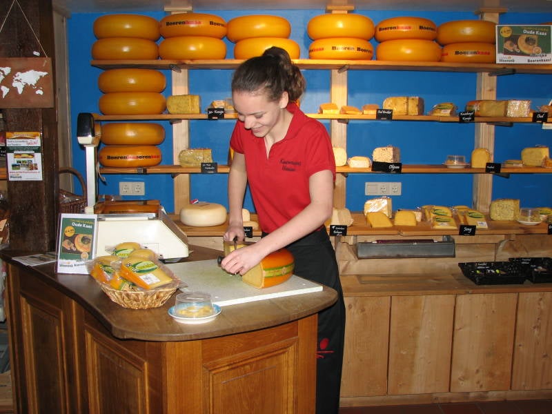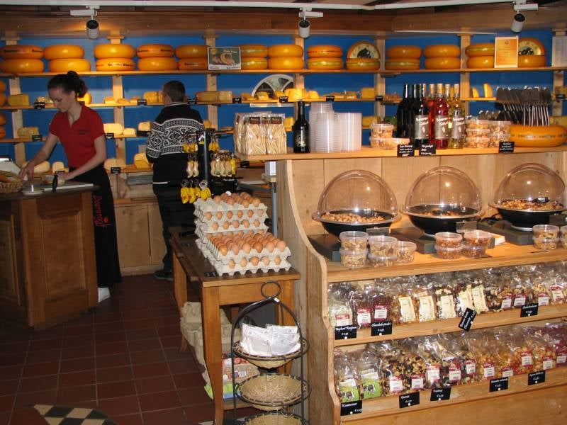 In het kaaswinkeltje liggen vele soorten kaas, wanneer je een stukje kaas wilt kopen, mag je altijd proeven en snijden ze het vers van een grote kaas af.