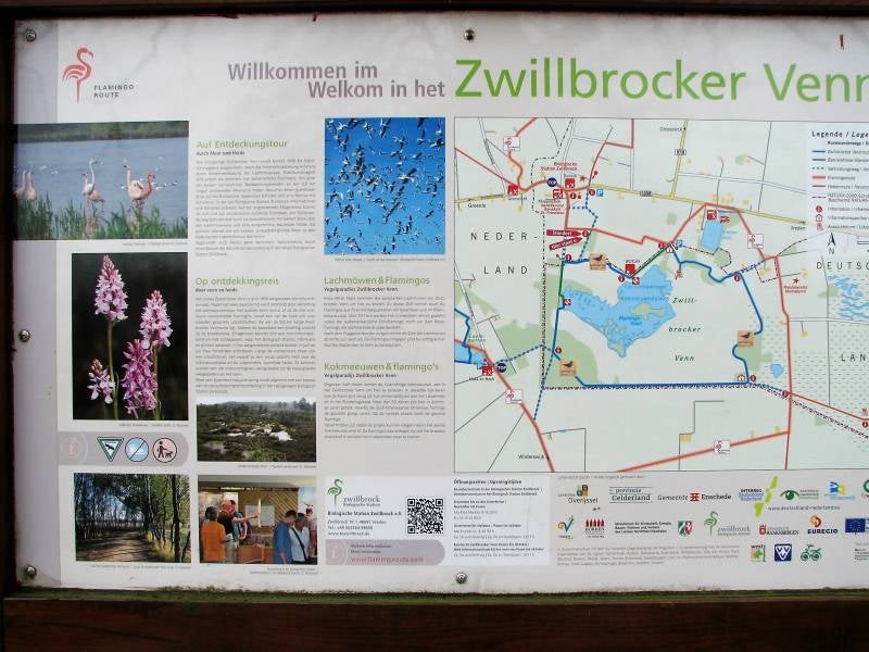 De zon schijnt minimaal, de bewolking overheerst in de ochtend, maar de temperatuur is prima, dus we gaan de uit gezette fietsroute rijden. We komen eerst door Groenlo waar we bij de stadswal twee kanonen zien, die vroeger voor de verdediging van Groenlo werden gebruikt. en rijden dan richting Zwillbrock. Daar is het Zwillbrocker Ven wat een natuurgebied is, het herbergt de grootste kokmeeuwen kolonie van Duitsland en het is tevens wereldwijd de meest noordelijk gelegen broedplaats voor een kolonie van ongeveer 40 Flamingo's, deze vogels zijn er van maart tot eind mei en trekken dan naar warmere oorden. De kokmeeuwen zijn het hele jaar aanwezig.