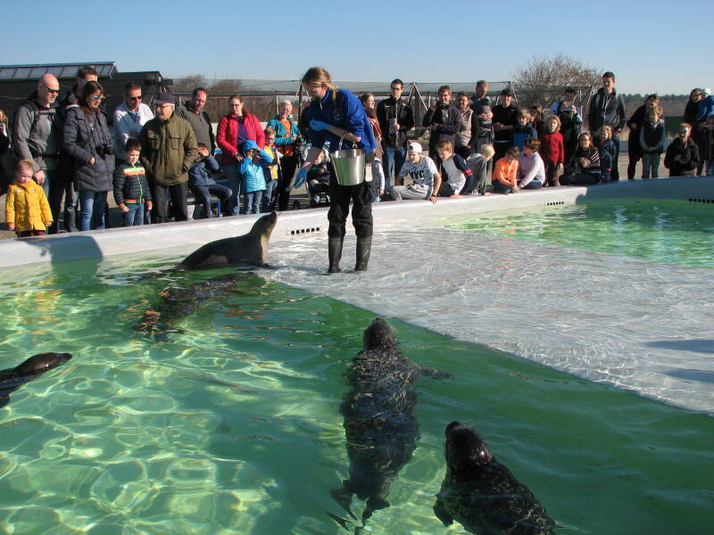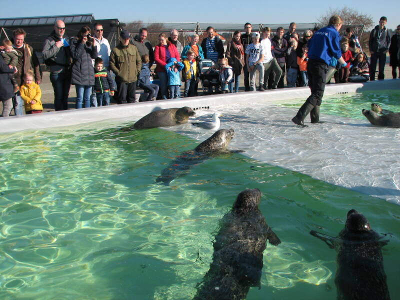 Het is niet ver fietsen, ongeveer 8 km. We zijn ruim op tijd om het voeren van de zeehonden te zien en nuttigen nog een warme chocomel met appelgebak en niet te vergeten slagroom. Daarna zijn we naar het zeehonden bassin gegaan waar de dieren worden gevoerd, tijdens het voeren wordt er ook een uitleg gegeven waarom de dieren in Ecomare zijn.