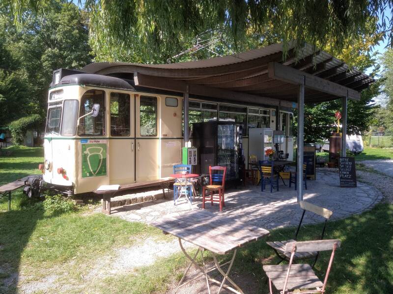 Om zes uur zijn we in de Stube van de camperplaats nog een wijntje gaan drinken en hebben ook daar maar gelijk gegeten, gril en curry worst met kartoffeln salade. Het smaakt ons prima.