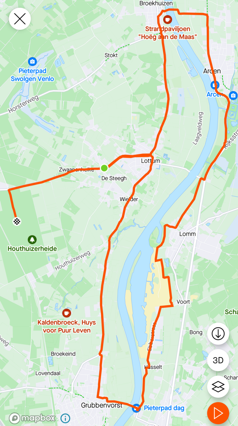 Via Lottum rijden we naar Grubbenvorst varen over naar Velden en skeeleren dan aan de andere kant van de Maas naar Lomm en vandaar naar Arcen waar we bij "'t Zoete Genot" een drankje nuttigen. Vandaar naar de brouwerij van Hertog Jan en dan het pontje Arcen - Broekhuizen en zo terug naar Lottum en de camperplaats. Toch een rondje van 25 kilometer.