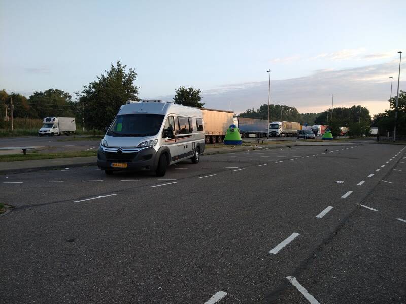 We staan om 5 uur op en rijden om half zes naar de camperstalling, we doen de laatste dingen in de camper en rijden om zes uur weg richting Hazeldonk waar we af hebben gesproken met Jan en Wilma. Het is nog rustig op de weg en we zijn om half zes bij de grensovergang. Om tien voor zeven komen Jan en Wilma met de caravan aan, we drinken nog een koffie en thee en rijden dan weg richting Antwerpen.