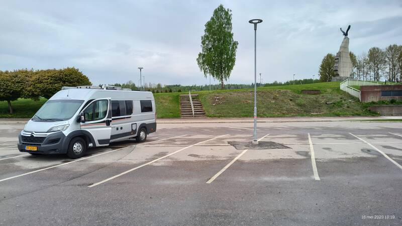 Na de stop komen we in Arvidsjaur, het is er druk en we vinden daar geen geschikte plek om te overnachten. We rijden verder en komen bij een camperplaats die nog gesloten is, Fop belt de eigenaar en die geeft aan dat we aan de andere kant van de weg mogen staan, bij zijn hytters, op het asfalt. Een leuke service waar we niets voor hoeven te betalen.
