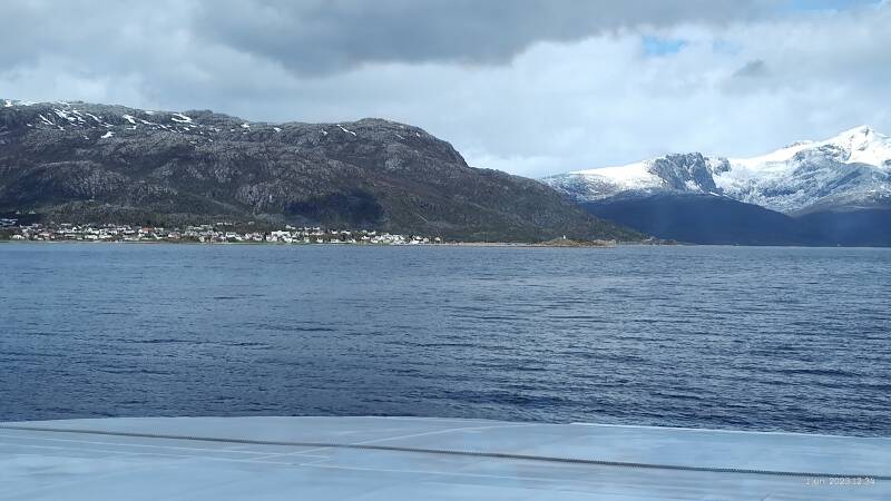 Vannacht heeft het geregend en gesneeuwd, maar de temperatuur is boven nul, dus de sneeuw is al weer weg. We ontbijten en gaan om kwart over negen weg bij camping Ballangen, we rijden via de E6 naar de pont van Skarberget naar Bognes.