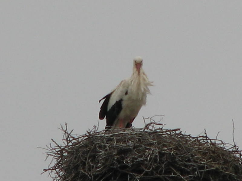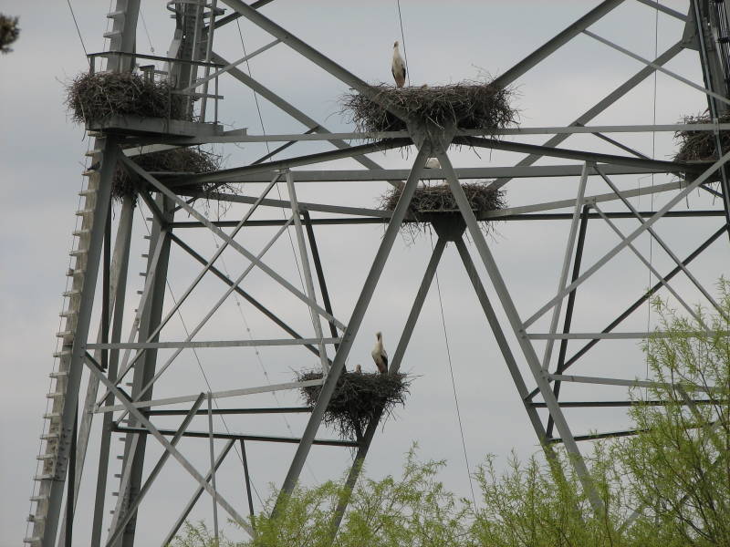 Op de terugweg de ooievaars gespot in de hoogspanningsmast, er zijn negen nesten gebouwd in de mast en zijn allemaal bezet door de ooievaars.