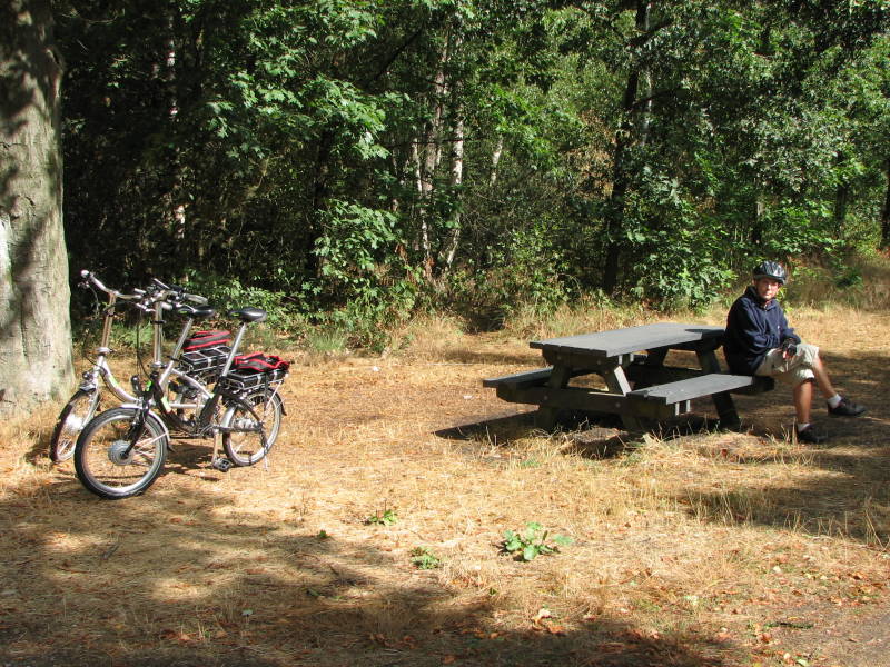 Heerlijk uit geslapen en pas om 9 uur aan het ontbijt, de weersverwachting is minder goed als gisteren voorspeld en we besluiten om een wandeling te maken, de "Rode paaltjes route", een wandeling van ongeveer 4,5 km door het bos bij de camperplaats, zo gezegd zo gedaan, de wandeling is mooi, maar we zijn bijna terug en dan breekt het onweer los, we krijgen nog een paar druppels maar zijn net op tijd bij de camper.