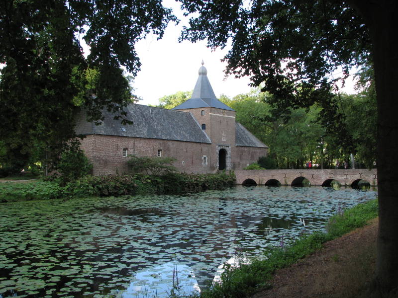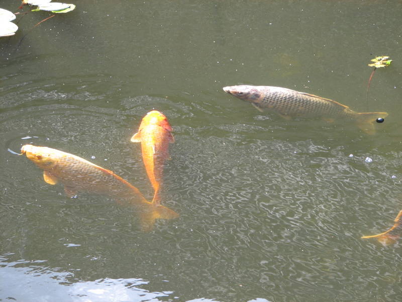De omgeving is mooi en afwisselend, dan weer langs akkers dan weer door het bos, in Arcen drinken we koffie bij, ja het kan niet missen, bij Clevers, en weer een koffie compleet. Ook hebben we bij de Kasteeltuinen gekeken, maar dat bewaren we voor een volgende keer, als we een hele dag de tijd hebben. In de vijver van de Kasteeltuinen zwemmen reuze karpers, zie foto. Na de koffie via de pont terug naar Lottum, waar we worden omgeleid want het centrum is al afgesloten voor het Rozenfestival. We zijn om ongeveer 1 uur terug op de camperplaats en hebben dan 30 km gefietst.