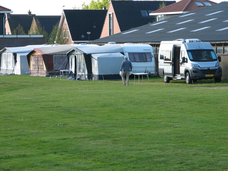 De camping waar we staan is een camping met 35 plaatsen, i.v.m. het Corona virus zijn de sanitaire voorzieningen gesloten en dat is ook één van de redenen dat het rustig is, want volgens Anja, de eigenaresse, staat de camping met dit soort dagen normaliter vol. Nu staan er wat seizoeners en een los vaste.