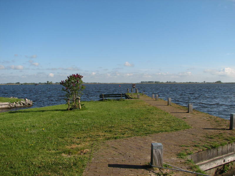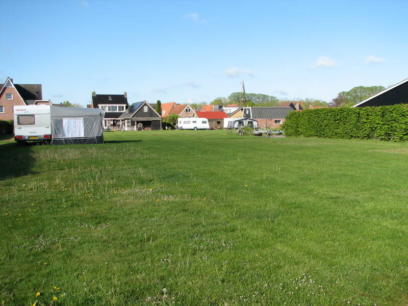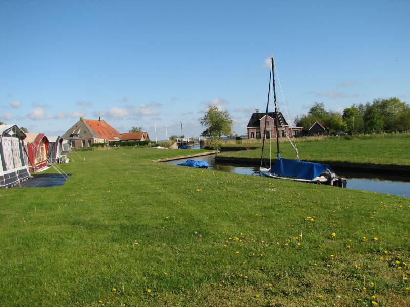 We rijden door de Flevo polder en drinken onderweg nog een kopje thee, we zijn om kwart over elf op de camping en worden hartelijk begroet door Jan en Wilma, ook de eigenaresse van de camping komt er bij en wijst ons een paar plaatsen waar we kunnen gaan staan. We kiezen voor een plaats naast Jan en Wilma. We kijken over de landerijen en een slootje waar de bootjes door heen varen richting het Langwarder Wielen.