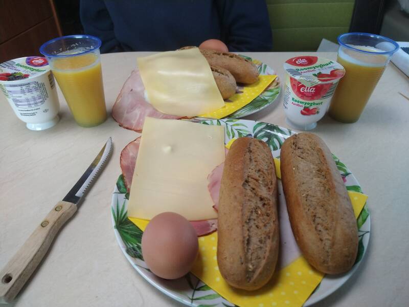 Om elf uur is de brunch, helaas is het te koud om bij de tent te blijven zitten, we nemen broodjes, jus d'orange en nog andere lekkere dingen mee en gaan naar de camper terug. We brunchen in de camper, helaas het is niet anders, het weer werkt niet helemaal mee.