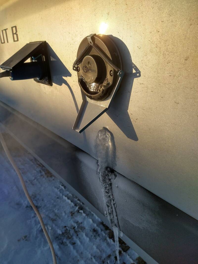 Het is koud geweest vannacht, -12 graden C. in de camper heerlijk warm en geen rare dingen zoals bevroren waterleidingen of uitvallen van de kachel. We hebben enkele broodjes en croissants besteld, en hebben een heerlijk ontbijt. Het condens van de uitlaat van de kachel moet via het bakje van de camper aflopen, maar helaas 's nachts vriest het tegen de camper aan en loopt het tussen de uitlaat en bakje door.