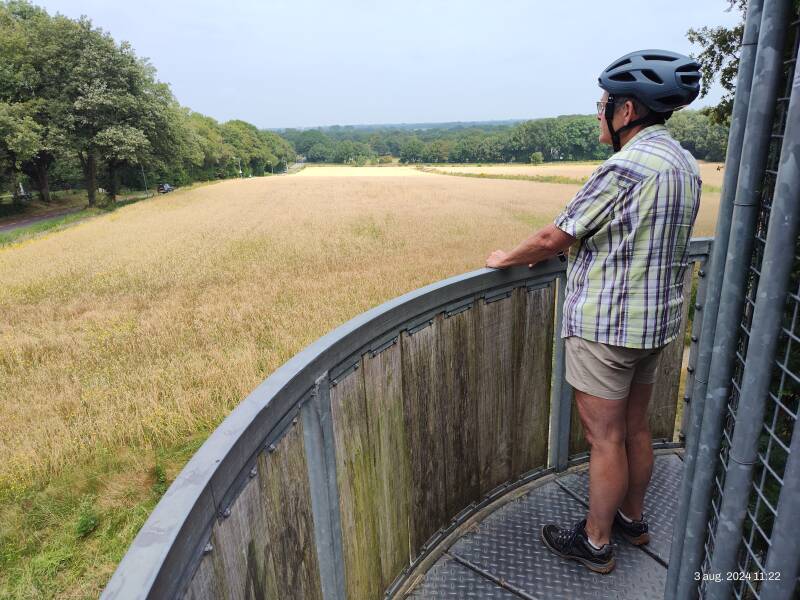 We hebben ondanks de warmte prima geslapen en staan om 8 uur op, we ontbijten buiten, doen rustig aan en gaan om half elf fietsen. We hebben een route uitgezocht van 24 km, naar Wekerom, Lunteren en zo weer terug naar de camperplaats. Onderweg drinken we een koffie met appelgebak met slagroom. De route is mooi, langs landerijen en door het bos.